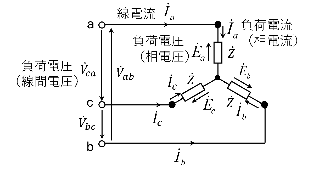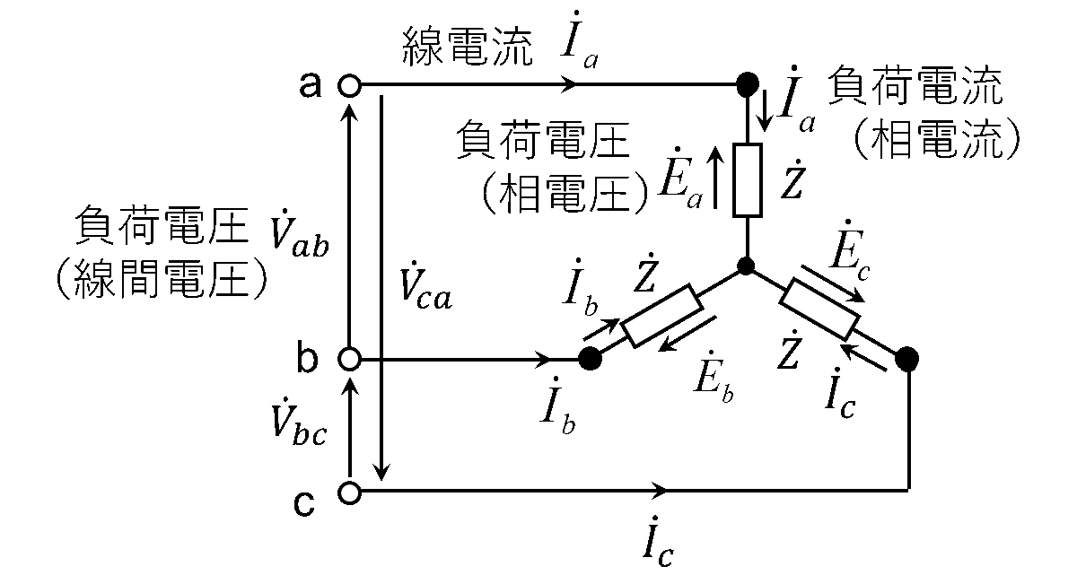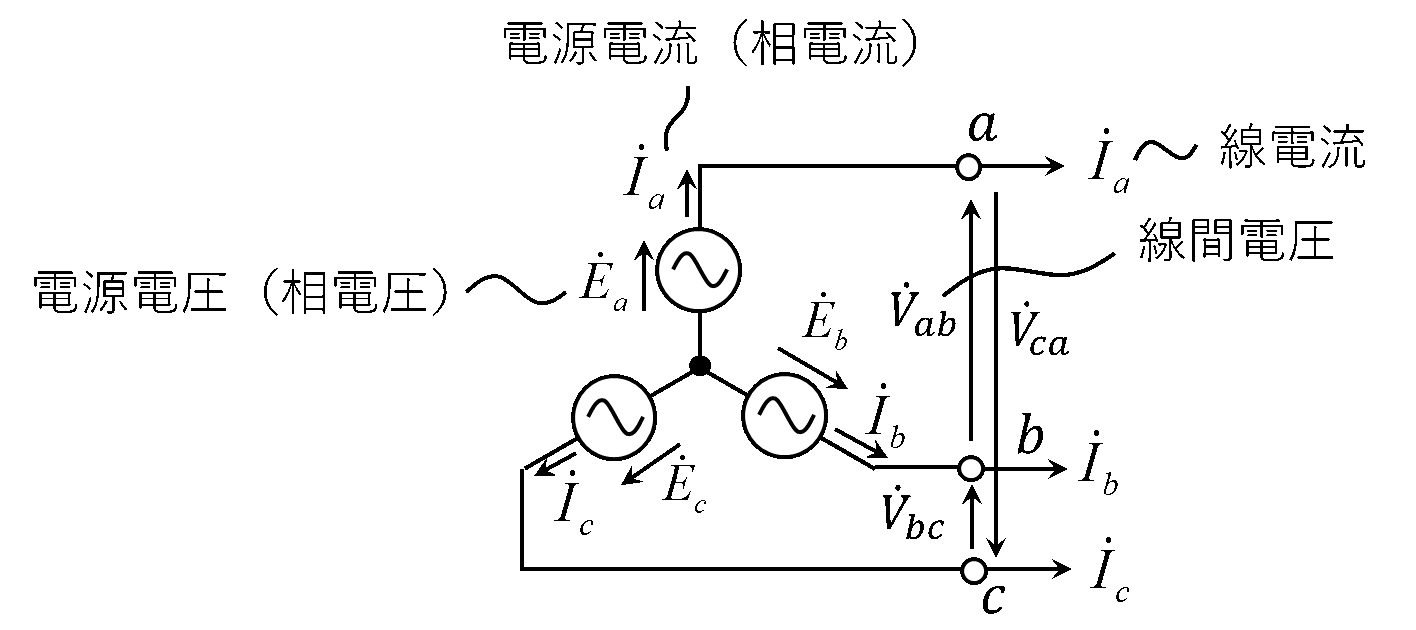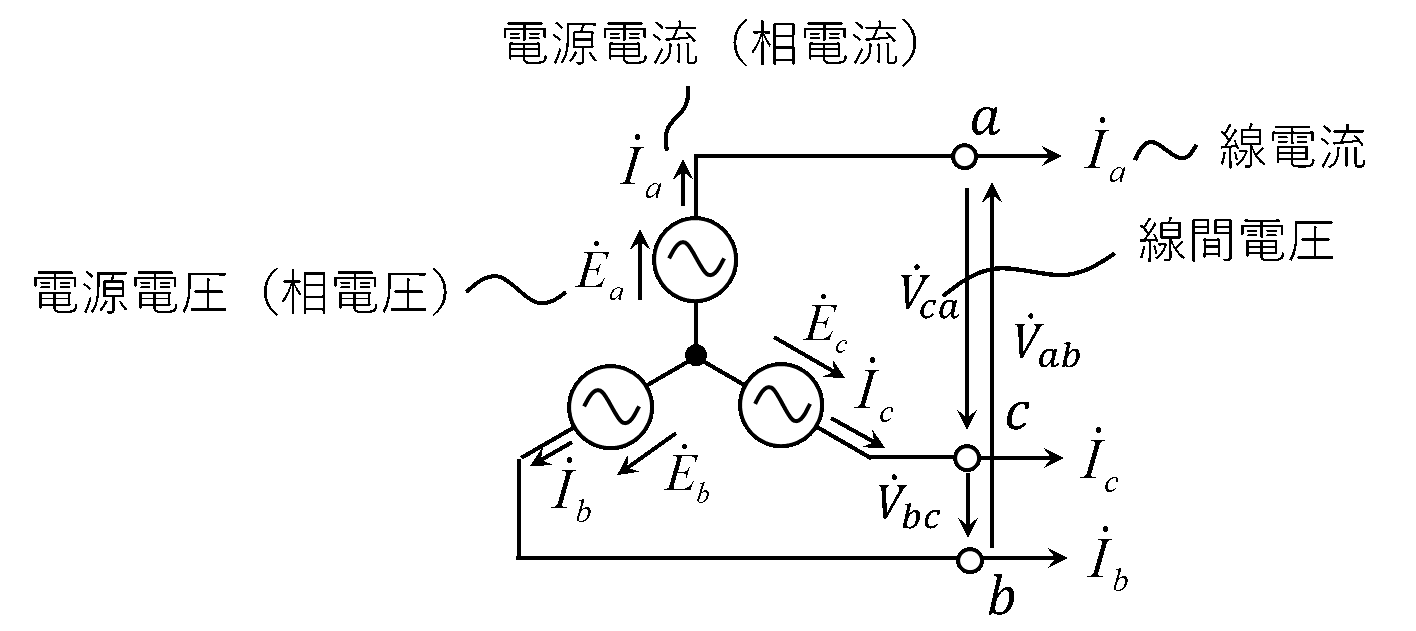Y結線の場合の電源電圧(相電圧)と線間電圧、電源電流と線電流の関係図を第3図に示す。第3図において、Y結線の各相電圧を\(\dot{E}_a\)、\(\dot{E}_b\)、\(\dot{E}_c\)とし、各相電流を\(\dot{I}_a\)、\(\dot{I}_b\)、\(\dot{I}_c\)とする。