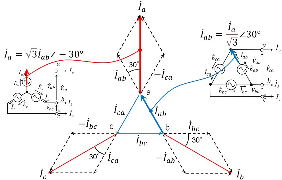 第24図では、第19図に示す電源電流と同様、\(\dot{I}_a\)は\(\dot{I}_{ab}\)に対し大きさが\(\sqrt{3}\)倍、位相が30°進みとなることを示している。ただし、位相の進み遅れの関係は同じであるが、各電流の向きが反対になっていることに注意が必要である。