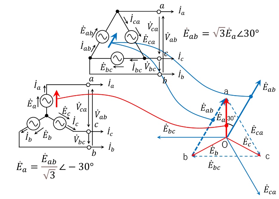 上記のΔ結線とY結線の電源電圧の変換対応図を第4図に示す。EabはEaと −Ebのベクトル和(\(\dot{E}_{ab}=\dot{E}_a-\dot{E}_b\))になる。Δ結線の各相電圧ベクトルは、破線でΔ結線されている状態を示し、実線で各相電圧ベクトルの矢尻を中心に移動した状態を示している。第4図より、相順abcの場合、EaはEabに対し位相が30°遅れ、大きさが1/\(\sqrt{3}\)倍であることが判る。
