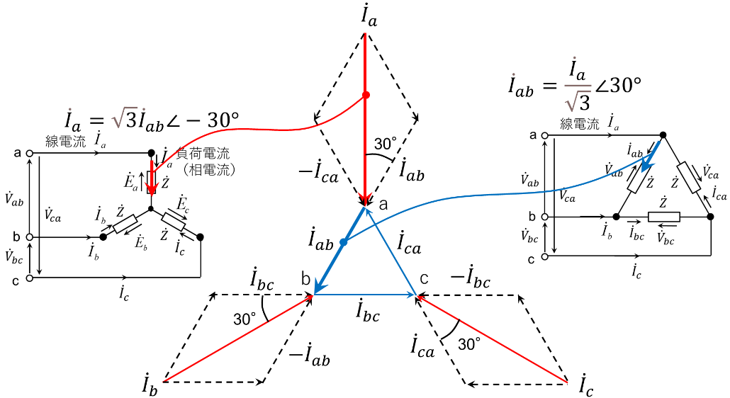 第12図では、第7図に示す電源電流と同様、\(\dot{I}_a\)は\(\dot{I}_{ab}\)に対し大きさが\(\sqrt{3}\)倍、位相が30°遅れとなることを示している。ただし、位相の進み遅れの関係は、電源電流と同じであるが、負荷側各電流の向きは電源側の反対向きになっていることに注意が必要である。