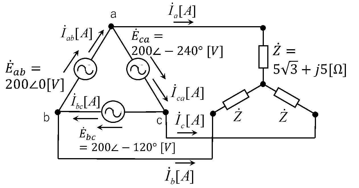 極形式を用い、Δ結線電源\(\dot{E}_{ab}=200\angle0°\) [V] をΔ→Y変換すると、\(\dot{E}_a=\frac{200}{\sqrt{3}}\angle30°\) [V] となる。