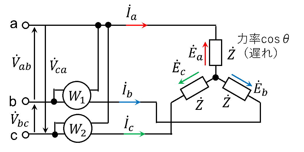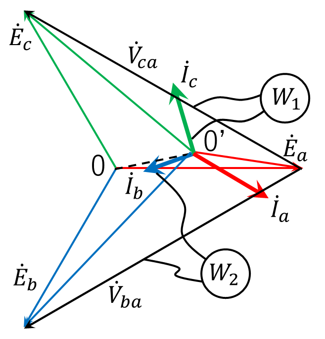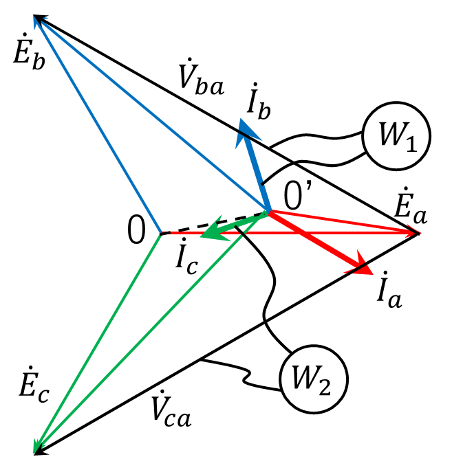 先に示した第1図の例では、a相を基準相に選び、電力計W1はba間の線間電圧 \(\dot{V}_{ba}\) とb相電流 \(\dot{I}_b\)、電力計W2はca間の線間電圧 \(\dot{V}_{ca}\) とc相電流 \(\dot{I}_c\) を入力とすることで、2つの電力計の測定電力W1とW2の和で三相電力が測定できている。一方、第2図の例では、電力計W1の基準相はa相、W2の基準相はb相と相違しており、測定電力W1とW2の和で三相電力の測定はできていないことが解る。