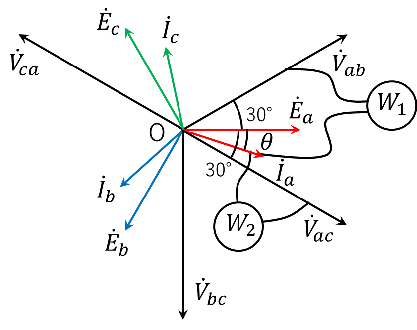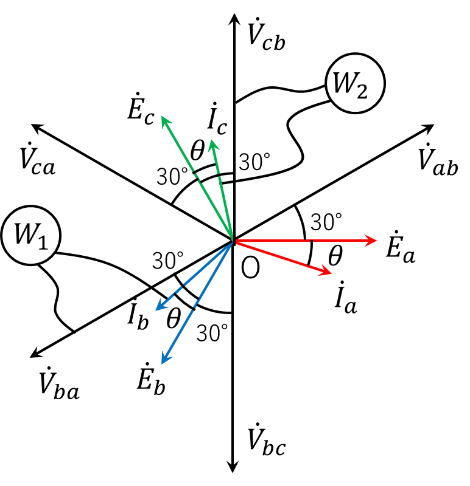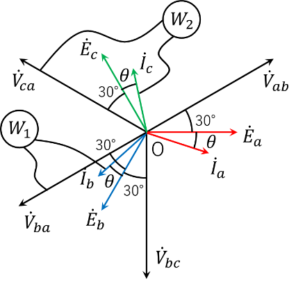 W1=Vba Ib cos(30°−θ)=√3 Eb Ib cos(30°−θ)=√3 EI cos(30°−θ) [W]