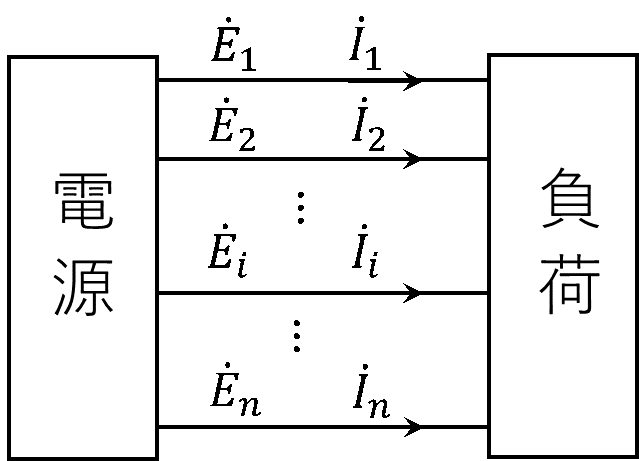【証明】 第3図に示すように、n相の負荷にn相の電源から電力が供給されているとする。各相の負荷中性点に対する電位、すなわち相電圧を \(\dot{E}_1\)、\(\dot{E}_2\)、\(\dot{E}_3\)、⋯、\(\dot{E}_n\) とし、線電流を \(\dot{I}_1\)、\(\dot{I}_2\)、\(\dot{I}_3\)、⋯、\(\dot{I}_n\)、すなわち線電流の共役複素数を \(\bar{I}_1\)、\(\bar{I}_2\)、\(\bar{I}_3\)、⋯、\(\bar{I}_n\) とすれば、負荷に供給される複素電力 \(\dot{K}\) は、遅れ無効電力を正として、