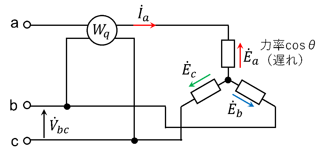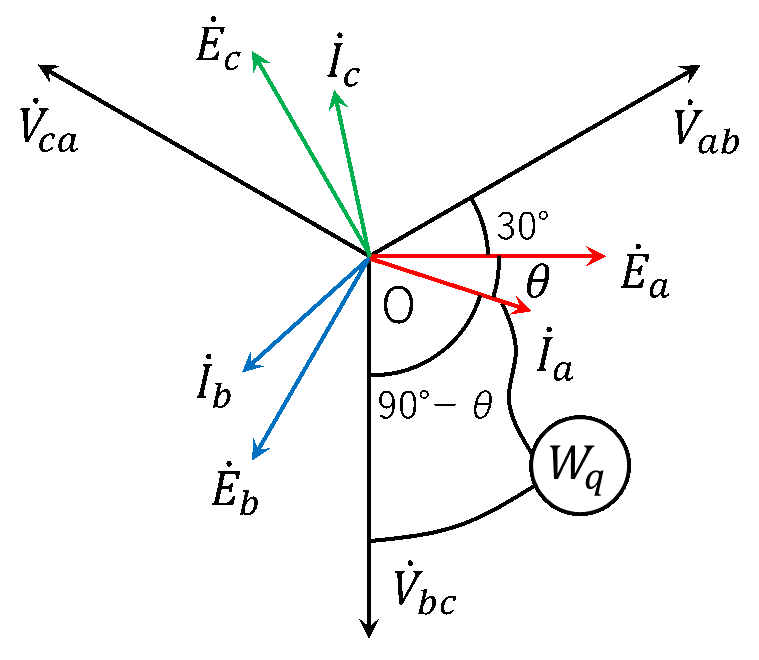 第5図に無効電力の測定法、第6図にベクトル図を示す。Vbc=V、Ia=I として、電力計の測定値は Wq=Vbc Ia cos(90°−θ)=VI sinθ 、従って三相無効電力は Q=√3 Wq となる。