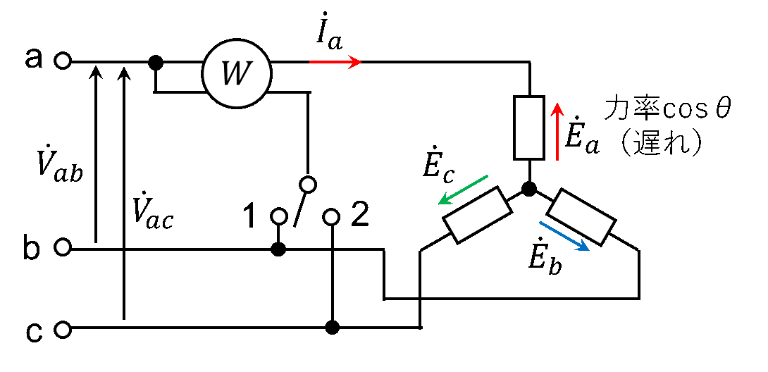 二電力計法の応用として、第7図に示すように、一つの電力計を用い、相を切り換えて三相電力を測定する方法がある。第8図に平衡回路である場合のベクトル図を示す。それぞれの電力計の測定値は、Vab=Vac=V、Ia=I として、