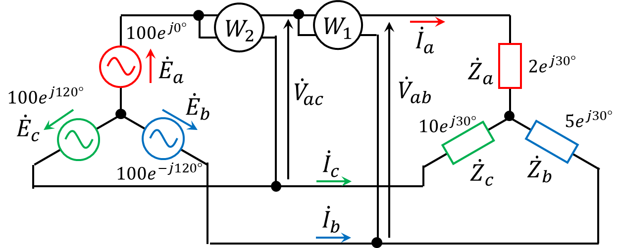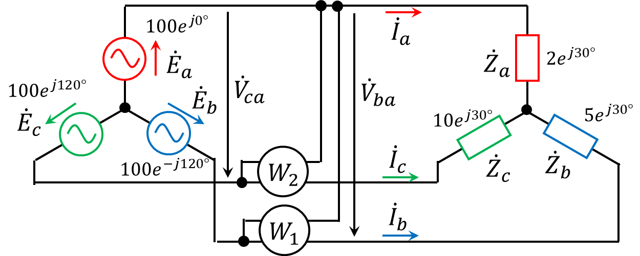 したがって、負荷が平衡の場合には \(\dot{E}_a+\dot{E}_b+\dot{E}_c=0\) なので、\(\dot{K}=P+jQ=3\dot{E}_a \bar{I}_a\) となるが、負荷が不平衡の場合には、各相の電力は同じではないから、2台の電力計の合計は三相電力の値を表すことにはならない。この例を【例題2】に示す。