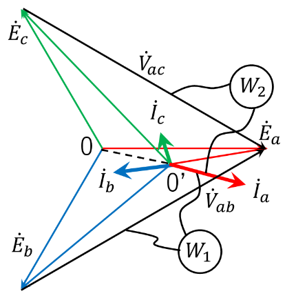 \(\dot{K}=P+jQ=\dot{V}_{ab} \bar{I}_a+\dot{V}_{ac} \bar{I}_a\) = \((\dot{E}_a-\dot{E}_b)\bar{I}_a+(\dot{E}_a-\dot{E}_c)\bar{I}_a\)