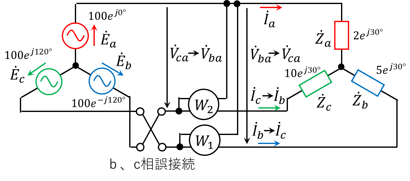 配線誤接続の場合には、相順abcのまま2相が逆に接続される状態なので、平衡回路の場合には、2相の記号を読み替えるだけで、2台の電力計の測定電力は、誤接続前と同じ大きさになる。不平衡の場合には、負荷のインピーダンスが2相で逆になってしまうので、負荷側中性点電位が変わってしまい、2台の電力計の測定電力は、誤接続前と大きさが違ってくるが、合計の電力は、誤接続前と同じ大きさになる。一方、無効電力は、平衡、不平衡ともに、⑧式は成立しない。この例を【例題3】に示す。