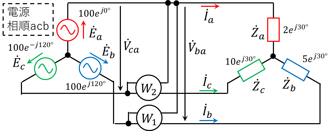 相順がacbの場合でも、ブロンデルの定理は適用できる。電源が相順abcからacbに変わった場合には、平衡回路であっても相順abcに対してベクトル図の構成が変わり、2台の電力計の測定電力も変わるが、合計の電力は同じ大きさになる。不平衡回路の場合には、相順abcに対して負荷側中性点電位が変わるので、2台の電力計の測定電力の大きさが違ってくるが、合計の電力は、同じ大きさになる。一方、無効電力は、平衡、不平衡ともに、⑧式は成立しない。この例を【例題4】に示す。