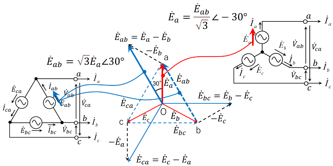 相順abcでΔ結線の場合の電源電圧と線間電圧、電源電流と線電流の関係図を第2図に示す。第2図において、Δ結線の各相電圧を\(\dot{E}_{ab}\)、\(\dot{E}_{bc}\)、\(\dot{E}_{ca}\)とし、各相電流を\(\dot{I}_{ab}\)、\(\dot{I}_{bc}\)、\(\dot{I}_{ca}\)とする。