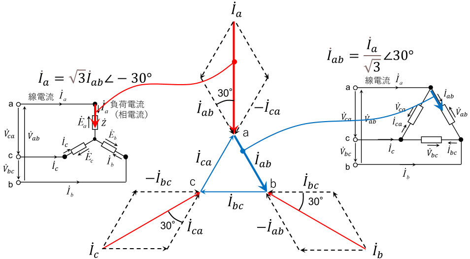 第12図では、第7図に示す電源電流と同様、\(\dot{I}_a\)は\(\dot{I}_{ab}\)に対し大きさが\(\sqrt{3}\)倍、位相が30°遅れとなることを示している。ただし、位相の進み遅れの関係は、電源電流と同じであるが、負荷側各電流の向きは電源側の反対向きになっていることに注意が必要である。