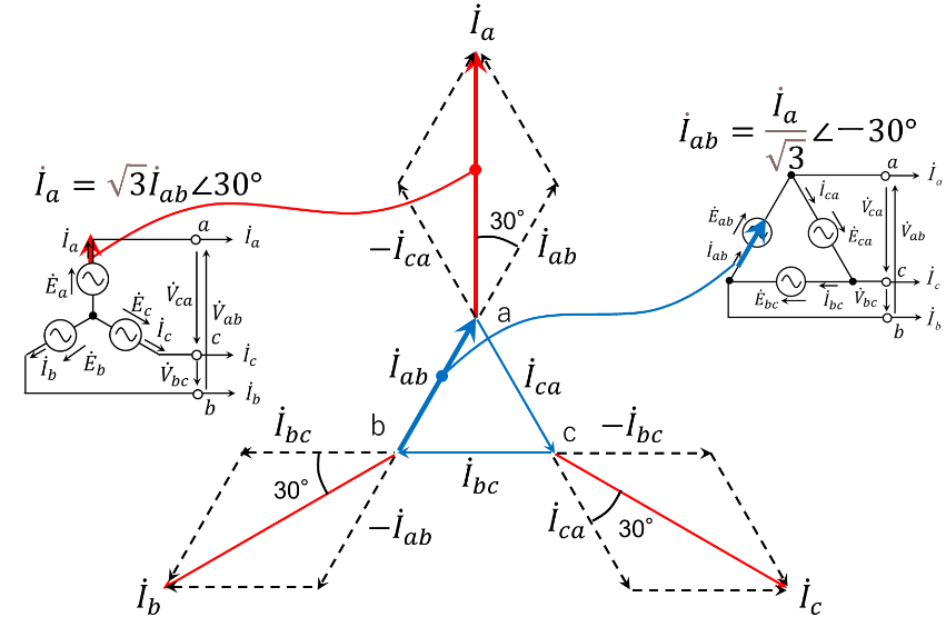 第24図では、第19図に示す電源電流と同様、\(\dot{I}_a\)は\(\dot{I}_{ab}\)に対し大きさが\(\sqrt{3}\)倍、位相が30°進みとなることを示している。ただし、位相の進み遅れの関係は同じであるが、各電流の向きが反対になっていることに注意が必要である。