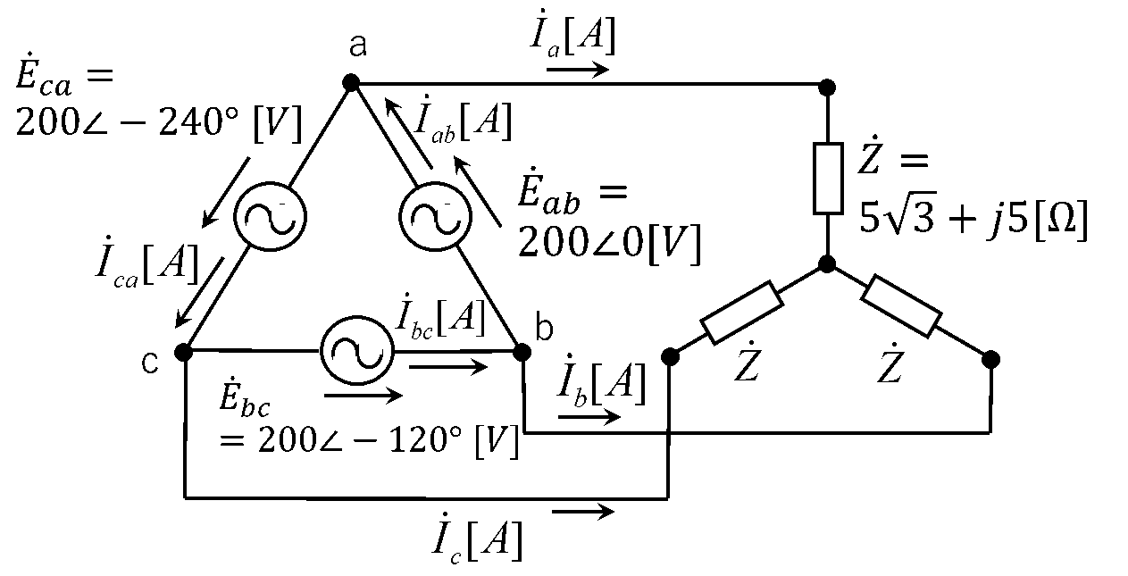 極形式を用い、Δ結線電源\(\dot{E}_{ab}=200\angle0°\) [V] をΔ→Y変換すると、\(\dot{E}_a=\frac{200}{\sqrt{3}}\angle30°\) [V] となる。
