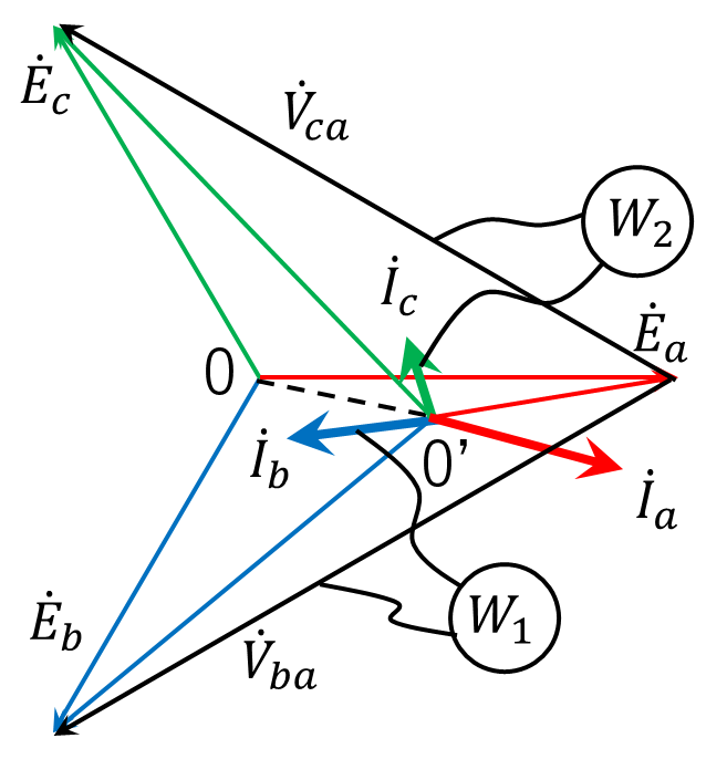 先に示した第1図の例では、a相を基準相に選び、電力計W1はba間の線間電圧 \(\dot{V}_{ba}\) とb相電流 \(\dot{I}_b\)、電力計W2はca間の線間電圧 \(\dot{V}_{ca}\) とc相電流 \(\dot{I}_c\) を入力とすることで、2つの電力計の測定電力W1とW2の和で三相電力が測定できている。一方、第2図の例では、電力計W1の基準相はa相、W2の基準相はb相と相違しており、測定電力W1とW2の和で三相電力の測定はできていないことが解る。